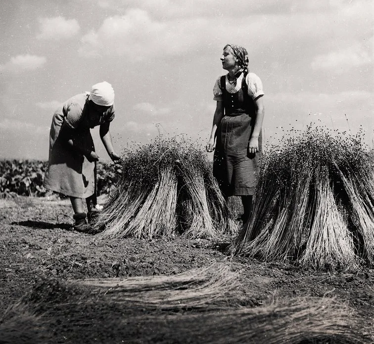 Abbildung: Irene und Elfriede Gutscher bei der Flachsernte beim Hardthof (1938)
